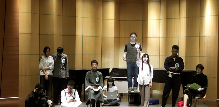 晚会后,我系一年级同学演出了自己改编、导演,王文娟老师做指导的话剧《有雷无雨》,这是王老师“艺术概论”课期末笔试之外的实践课考试内容,是我系历届同学们在王老师课堂出演的《暗恋·桃花源》、《背惊》、《南柯一梦》等剧目外的又一力作。这是一部略带荒诞色彩的校园剧,但荒诞决不意味着同学们是“跨掉的一代”,剧末,演员同学们从观众走廊上场的阳光澎湃的集体诗朗诵“青春”之声,响彻大厅,无不震撼共鸣着每一位观者的心。